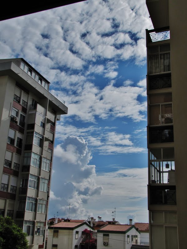 Apesar de a zona onde morarmos ter qualidades únicas, a rua do nosso prédio não é particularmente bonita, contrastando com as traseiras. Mas as nuvens que se fotografam da janela da cozinha, são sempre qualquer coisa.