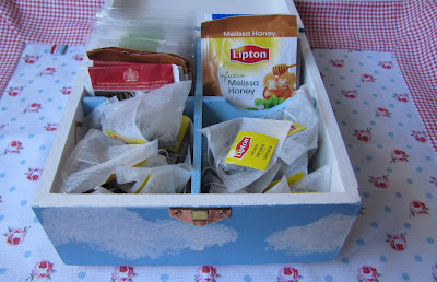 Hoje, lá consegui ir levantar esta prenda: uma caixa de chá com nuvens, pintada pela Nani.