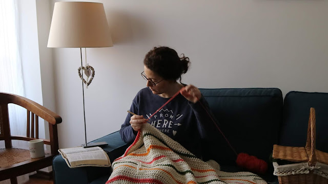 Aqui há uns dias, a ideia voltou, porque me pus a pensar em coisas que me ajudassem a parar, a meditar no meio de toda a correria que agora se avizinha. Depois de uns vídeos no Youtube e uma ida ao armazém, comecei o projecto simples de uma mantinha às riscas. As mãos depressa ganharam memória, deixando livre a minha mente para pensar, descontrair, orar, recitar os textos que sei de cor e propor-me a novos. É a conjugação perfeita, agora que sentar-me no sofá não é correr o risco de ter a casa a pegar fogo, noutra divisão.